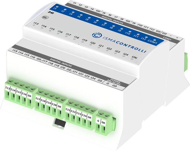 Power Supply: 24 VDC/24 VAC | Dry Contact Inputs, Fast Pulse Counter Up to 100 Hz Saved in EEPROM Memory | BACnet MS/TP, Modbus RTU/ASCII, Free Software iSMA Configurator, Dedicated Niagara Framework Modules | RS485 Interface, Mini USB Type B Interface, Status LED Indicators, DIN Rail Mounted, 24 On Board Inputs
