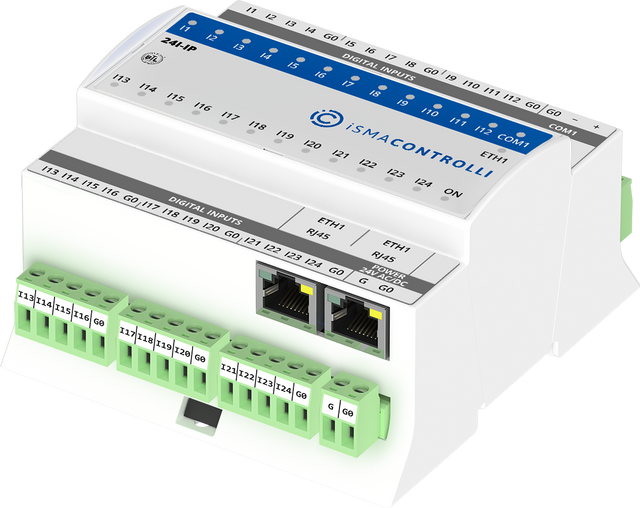Multiprotocol I/O Module with a MAX number of Digital Inputs - a powerful addition to any building automation system - Digitalize buildings with reduced engineering time using the powerful 24 digital inputs module, which works as a remote I/O over IP with open protocols, BACnet IP, and Modbus TCP/IP. The module is designed for data monitoring in data centers and HVAC applications. Open protocols standard offers the versatility of installing the modules in both new and existing facilities, whether it is a system expansion or a retrofit. The maximum number of the most popular types of inputs or outputs allows the module to be a versatile controller extension, whether in a small or large facility. 24 Digital Inputs - Dry contact inputs - made for monitoring. 100 Hz fast pulse counter with override function saves the real-time values to the EEPROM memory. Modbus TCP/IP to Modbus RTU/ASCII Gateway - Built-in Modbus gateway on the COM1 port enables integration of up to 128 Modbus slave devices to the IP layer. Simplified Configuration and Commissioning Process - The module allows for seamless configuration over BACnet, Modbus, built-in web server, or dedicated free of charge tool. The ability to be powered from a USB port facilitates local testing and a straightforward updating process. Two Ethernet ports working in a switch mode allow for daisy chaining of multiple modules over the RJ45, which facilitates the cabling process and reduces engineering time. Quality and Reliability Confirmed by Certificates - iSMA CONTROLLI is a long-standing member of the BACnet community. The experience in developing high quality products and the BTL (BACnet Test Laboratory) certification confirms the excellent performance of communication using the BACnet protocol.