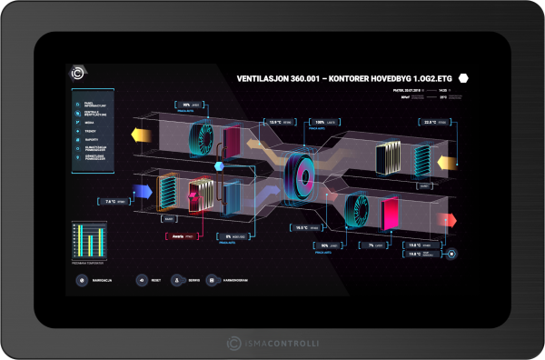 iSMA-D-PA10C-B1 is a 10.1’’ Industrial PC Panel with Android operating system. It has been designed to simplify the use of the Master Application Controller, MAC36NL. The panel can be connected with MAC36NL, JACE, or Supervisor powered by Niagara or any HTML5 web server-based controller to display graphics on a web page. The Android PC panel can also be used as a user interface. The dedicated iSMA Android Application, pre-installed on the panel, enables communication with multiple IP-based devices in the building. The aspect ratio of 16:10 with the 1280:800 resolution enable clear display of graphics. The panel is VESA compliant and can be wall-mounted. The panel has an extensive menu in 7 languages, where the displayed image can be easily customized