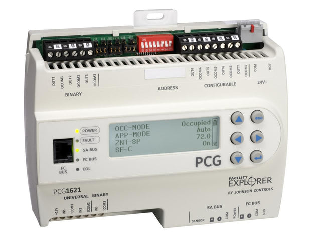 | Description | The FX-PCG16 controller is part of the Facility Explorer Controller (FX-PCG) family. The FX-PCG16 controller runs pre-engineered and user-programmed applications and provides the inputs and outputs required to monitor and control a wide variety of HVAC equipment. The FX-PCG controllers can communicate using either BACnet MS/TP or N2 communications protocols. These controllers used as MS/TP devices operate on an RS-485 BACnet® MS/TP Bus as BACnet Application Specific Controllers (B-ASC) and integrate into Johnson Controls and third-party BACnet systems. |