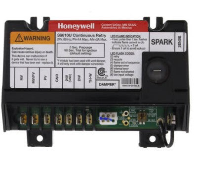 Honeywell S8610U3009 Universal Intermittent Pilot Control Module (One or Two Rods) has continuous retry trial time, configurable lockout timing of 15 or 90 seconds and configurable prepurge of 30 seconds or no prepurge. Field service replacement for most Honeywell, Robertshaw, Johnson, and UTEC (HSC) Intermittent Pilot Ignition Modules. Honeywell S8610U3009 provides electronic control of most intermittent pilot ignition systems used on gas-fired furnaces, boilers, and other heating appliances.