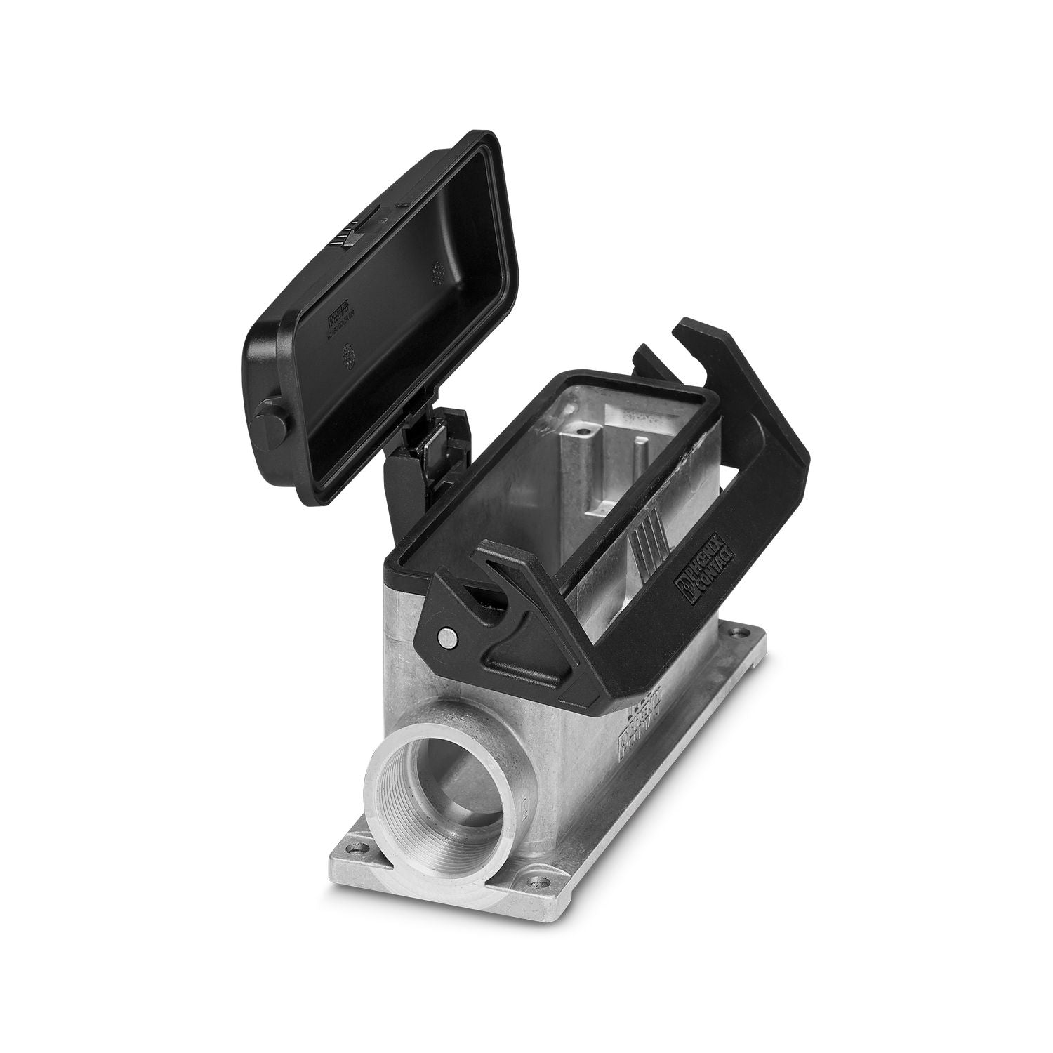 Phoenix Contact, Box Mounting Bases B24, with Single Locking Latch, Material: Die-Cast Aluminum, Salt Water Resistant, Protective Cover Material: PC, Cable Outlets: 2, Lateral, 2 x M32, Height: 68 Millimeter, Protective Cover: Yes, Standard 1412882
