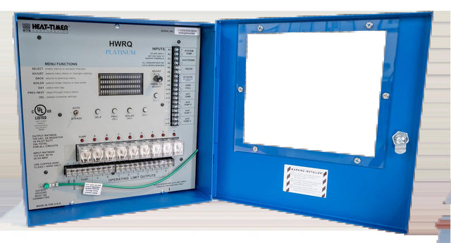 The HWRQ Platinum is an outdoor reset hot water multiple boiler control. It operates multiple boilers in an energy efficient logic to provide outdoor reset capability while rotating the boilers to even their wear. The HWRQ Platinum controls up to 8 boiler Stages (8 on/off, 4 2-Stage, 2 3 Stage, or 2 4-Stage boilers). Up to 24 additional stages can be added using multiple Extension Modules. In addition to building heating, the HWRQ platinum offer several Domestic Hot Water Priority options. The Internet Communication package offers a large group of optional sensors that can be monitored, logged, and alarm set. In addition, Heat-Timer can provide a cellular Internet connection to the control.