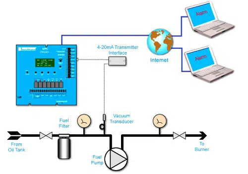 All boiler fuel oil types require a filter. Monitoring the oil filter contamination level and cleaning or replacing it when the contamination affects the burner operation can help reduce future burner problems. The Oil Filter Monitoring Kit triggers an alarm when the oil filter needs cleaning or replacing. It does that by measuring the vacuum created by the oil pump. The higher the vacuum the dirtier the filter. Oil Filter Monitoring For Internet Communication (HT# 950093-00) 4-20mA Transmitter Interface, Vacuum Transducer. The 4-20mA Transmitter Interface connects to Internet ready Platinum controls. The transducer and alarms must be configured on the web using the ICMS. Alarms will be in the form of viewable web alarm, E-mail, or text message to a cellular phone. Requires the purchase of MSI Hub (HT# 904284-00).