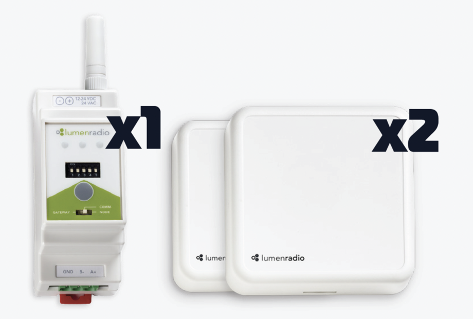 DIN rail mounted | BACnet MS/TP | 1 Unit LumenRadio 840-2120 | Connects 1 Devices | Reliable Mesh Wireless Router | W-BACnet DIN Rail | Includes: 2 Units LumenRadio 840-2110, 1 Unit LumenRadio 840-2120