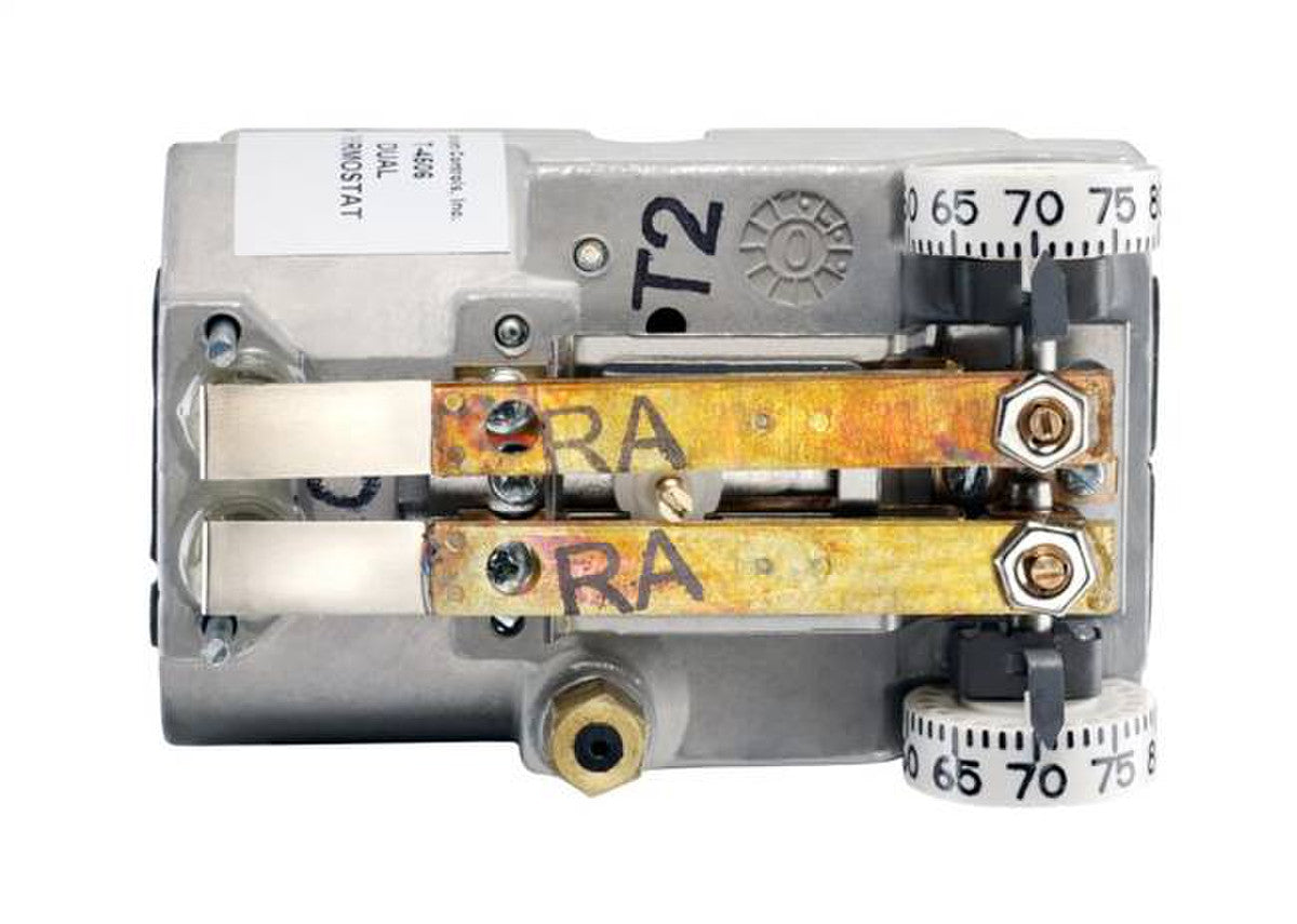 Johnson Controls, Dual Temperature Pneumatic Room Thermostat, Reverse Acting, Without Indexing Switch, Switchover at 17 PSIG, Horizontal Mount, T-4506-217