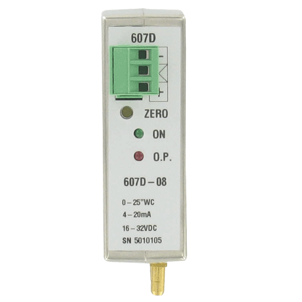 Series 607D DIN Rail Mount Differential Pressure Transmitter senses the pressure of air and compatible gases and sends a standard 4 to 20 mA output signal. The 607D housing is specifically designed to mount on a 35 Millimeter DIN rail in a panel. This mounting style allows for several units to be mounted closely together reducing required space. A wide range of models are available factory calibrated to 0.25 Percentage full scale accuracy in ranges from the very low 0.1 Inch w.c. to 25 Inch w.c. The span and zero controls are for field calibration. Units also include red/green LED status of proper transmitter operation. Versatile circuit design enables operation in 2-wire current loops.