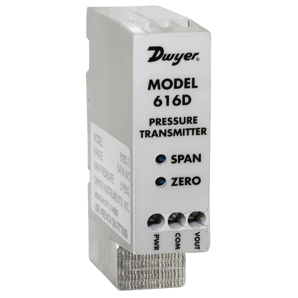 The Series 616D Differential Pressure Transmitter senses the pressure of air and compatible gases and sends a standard 4 to 20 mA or 0 to 10 VDC output signal. The 616D enclosure is specifically designed to mount on a 35 Millimeter DIN rail in a panel. This mounting style allows for several units to be mounted closely together reducing required space. The span and zero controls are for use when checking calibration. They are not intended for re-ranging. Versatile circuit design enables operation in 2-wire current loops.