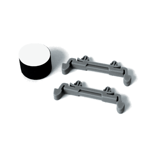 The DRC DIN rail adapter kit consists of two flexible plastic DIN rail clips, an adhesive backed foam "stop", and a snaptrack with punched holes. The snaptrack has pre-punched holes to accommodate the DRC clips. The stems on the clips t into the pre-punched holes in thesnaptrack and have flexible locking "wings" to prevent them from backing out once installed. The supplied adhesive backed foam stop is used to prevent movement of the board in the snaptrack. Snap into pre-punched holes in back of snaptrack. It can be installed either direction for vertical or horizontal mounting. DRC and snap track assembly removes easily from DIN rail with screwdriver or pry tool. DRC can be removed if snap track mounting method changes. Place foam stop on snaptrack under terminal block leads to keep board from moving.