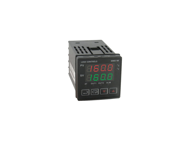 Monitor and control temperature or process applications with precision using the Series 16B controllers. The units offer two separate outputs for dual loop control in direct or reverse acting. Select relay, voltage, or current output combined with a second relay output. The Series 16B provides dual LED displays for local indication of process value and setpoint value. Output status, engineering scale, auto tuning and alarm status is also indicated on the front panel. Control methods include ON/OFF, PID, self-tune and manual tune. PID control is supported with 64 ramp/soak control actions. Two additional alarm outputs are standard on the Series 16B. The alarm outputs can be quickly configured by using the thirteen built-in alarm functions. The controller easily communicates with other external devices such as PC's and PLC's for data search and system integration using the built-in RS-485 interface. Up to 247 communication addresses are available with transmission speeds of 2400 to 38,400 bps. The Series 16B also features universal input, selectable deg F/ deg C, selectable resolution and security functions.