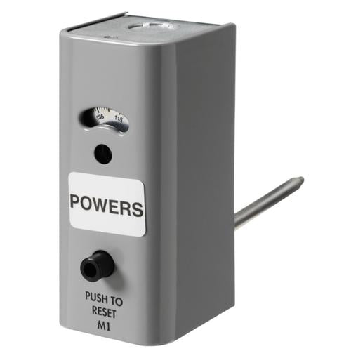 Duct-mounted High Temperature Limit Thermostat for "lock-out" control has a single setpoint with exposed setpoint indicator, single-pole, single-throw switch action, manual reset, 25 to 215 degrees Fahrenheit setpoint range, and a gray enamel cover.