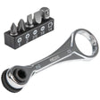 Klein Tools' Slim-Profile Mini Ratchet Set is the perfect answer for fastening in small, tight spaces. The 72-tooth, low-profile gear head only needs 5-Degrees of sweep allowing professionals to fasten in spots other drivers just won't fit. Handle is designed with a finger loop for control and convenience, and is made of high-strength Chromium-Vanadium steel for increased torque and long tool life. The 1/4-Inch dual-drive head has integrated 5/16 and 1/4-Inch nut drivers. This set also comes with a versatile set of bits including #1 and #2 Phillips driver bits, 3/16 and 1/4-Inch slotted driver bits, and an 1/4-Inch drive socket adapter. So, there's no need to go back to the toolbox.
