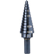 Straight, Double Fluted Step Drill Bits from Klein Tools provide cleaner cutting and drilling. The aluminum titanium coating is 10 times more durable than steamed black oxide for longer bit life. 3/8-Inch hex shank is durable, and has a firm, positive grip. Laser-etched markings provide quick size identification on primary holes. This step bit has 12-hole sizes from 3/16-Inch to 7/8-Inch (4.8 to 22.2 mm).