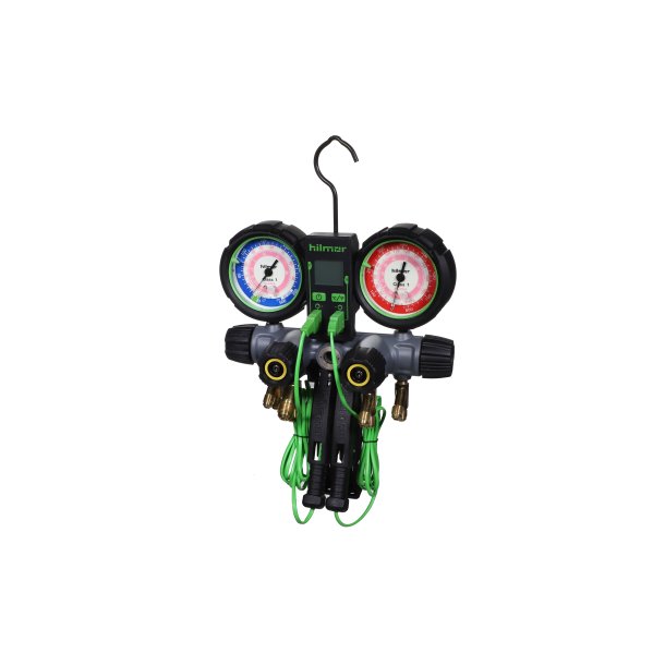 The hilmor 4-valve Aluminum Manifold is built to last with a forged aluminum body. It's designed to be leak-resistant with replaceable stainless steel valve seats, SAE-style O-ring and a securely seated large sight glass. A true 3/8 Inch bore throughout the valve gives you faster vacuum pulls. Front-mounted hose positions and a permanent location for temperature clamps result in added convenience. Plus, comfort grip handles are optimally sized for easier turns. Sold with our retooled gauges and optional 60 Inch refrigeration hoses with low-loss ball valve adapters.