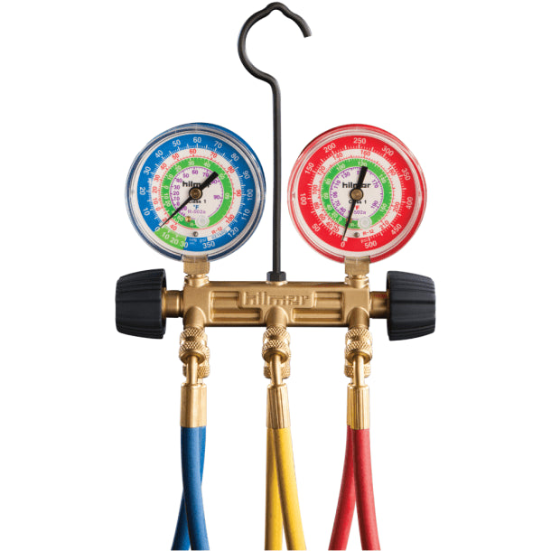The hilmor 2-valve Basic Brass Manifold with 60 Inch Refrigeration Hoses provides all the features you've come to expect from a standard manifold, and then some. It has a durable design, improved accessibility and smart functionality. The gauges have been optimized for greater 3-1/8 Inch readability with improved graphics, high-contrast color and glow-in-the-dark functionality. Sold with hilmor 60 Inch refrigeration hoses.